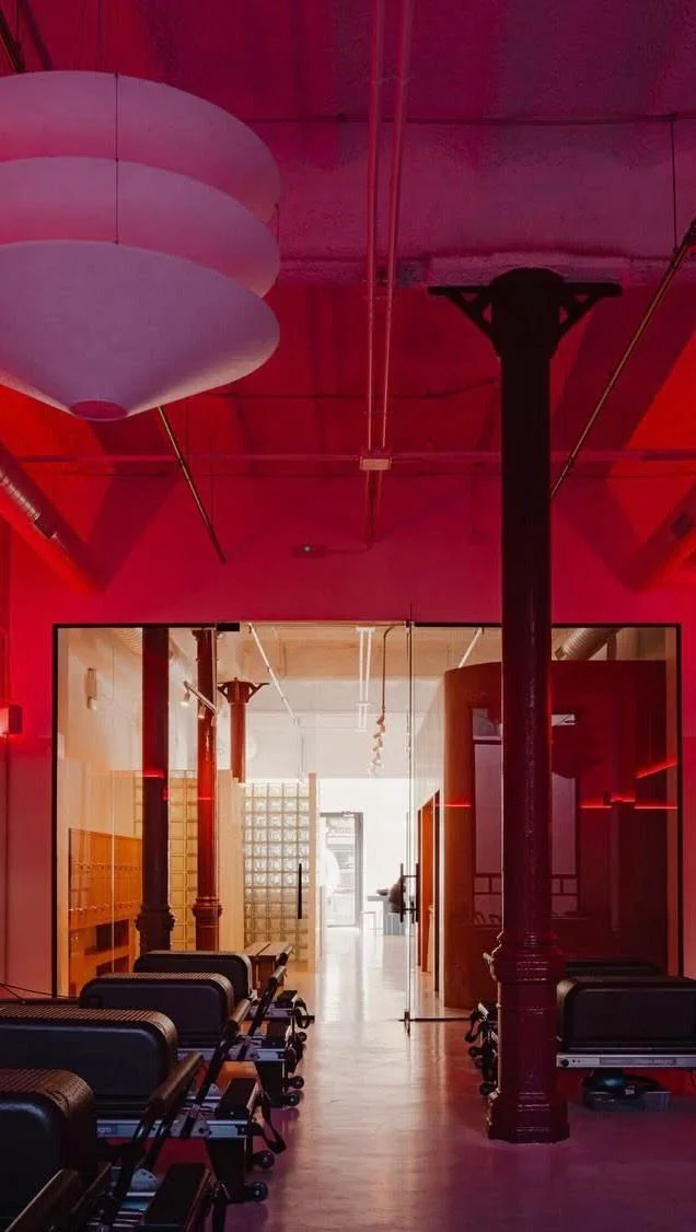 Pilates reformer machines in a fitness studio with pink and red lighting and large windows.